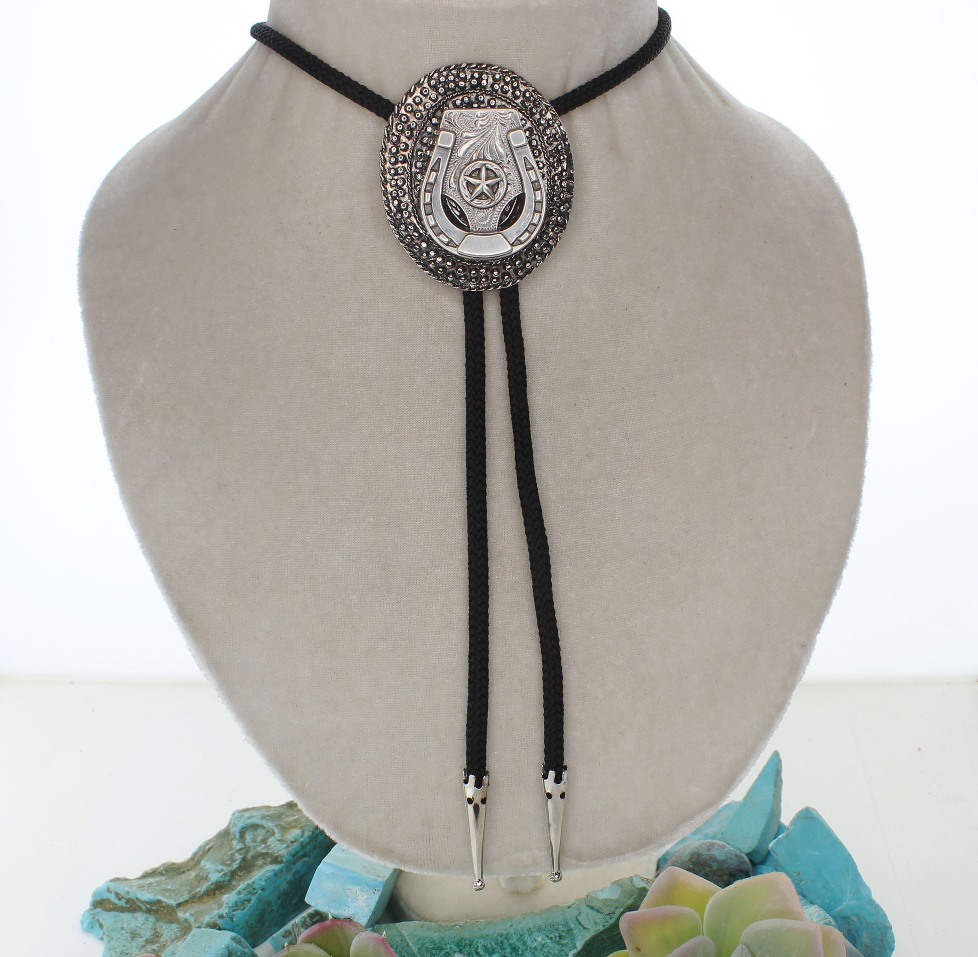 This bolo tie and collar tips set embodies classic Western style. The bolo tie features a large, ornate silver-tone slide with a detailed horseshoe design encircling a five-point star, bordered with raised beadwork. It is paired with a braided black cord tipped with silver arrowhead-like ends. The matching collar tips are triangular with embossed horseshoes and dangling silver feathers, adding movement and charm. Together, the set makes a bold, polished statement perfect for Western wear or Southwestern-inspired fashion.