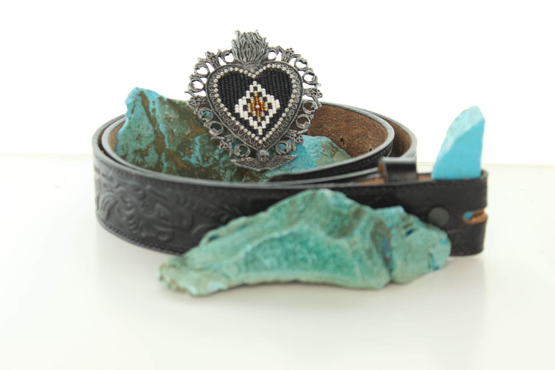 A black heart cradles a diamond of white, amber, and black beads, glowing like embers in the night. Framed by ornate metallic scrollwork and crowned with a flame motif, this buckle channels the Sacred Heart with a moody twist. It’s a piece of spiritual armor—bold, beautiful, and burning with quiet power.