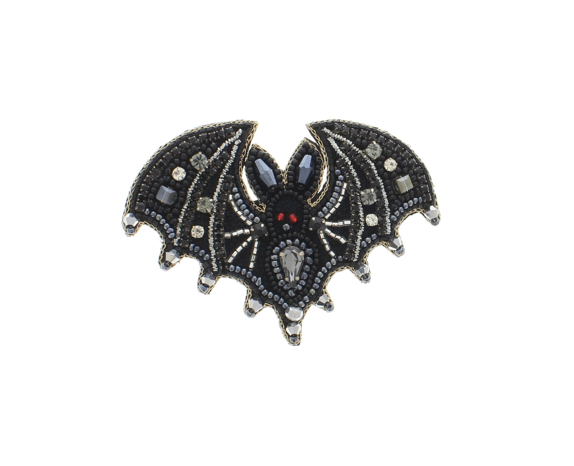 This striking black sequin bat pin features shimmering silver beads and crystals that accent its outstretched wings, catching the light with every movement. A perfect blend of gothic charm and celestial sparkle, it’s a bold accessory for those who love a touch of the mysterious.