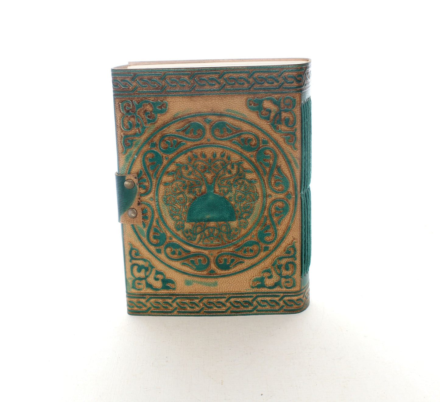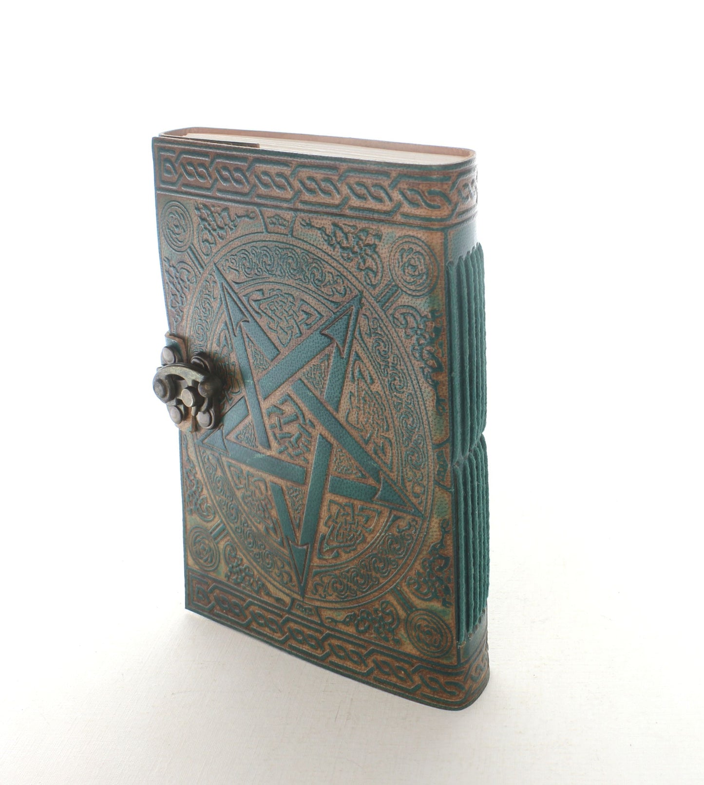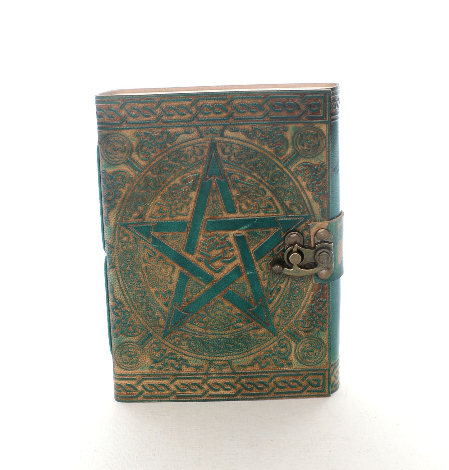 This handcrafted leather-bound journal features a rich green dyed cover adorned with a beautifully embossed Wiccan pentacle, symbolizing protection and balance. Perfect for spellwork, journaling, or personal reflections, its rustic charm and mystical design make it a treasured companion for seekers and writers alike.