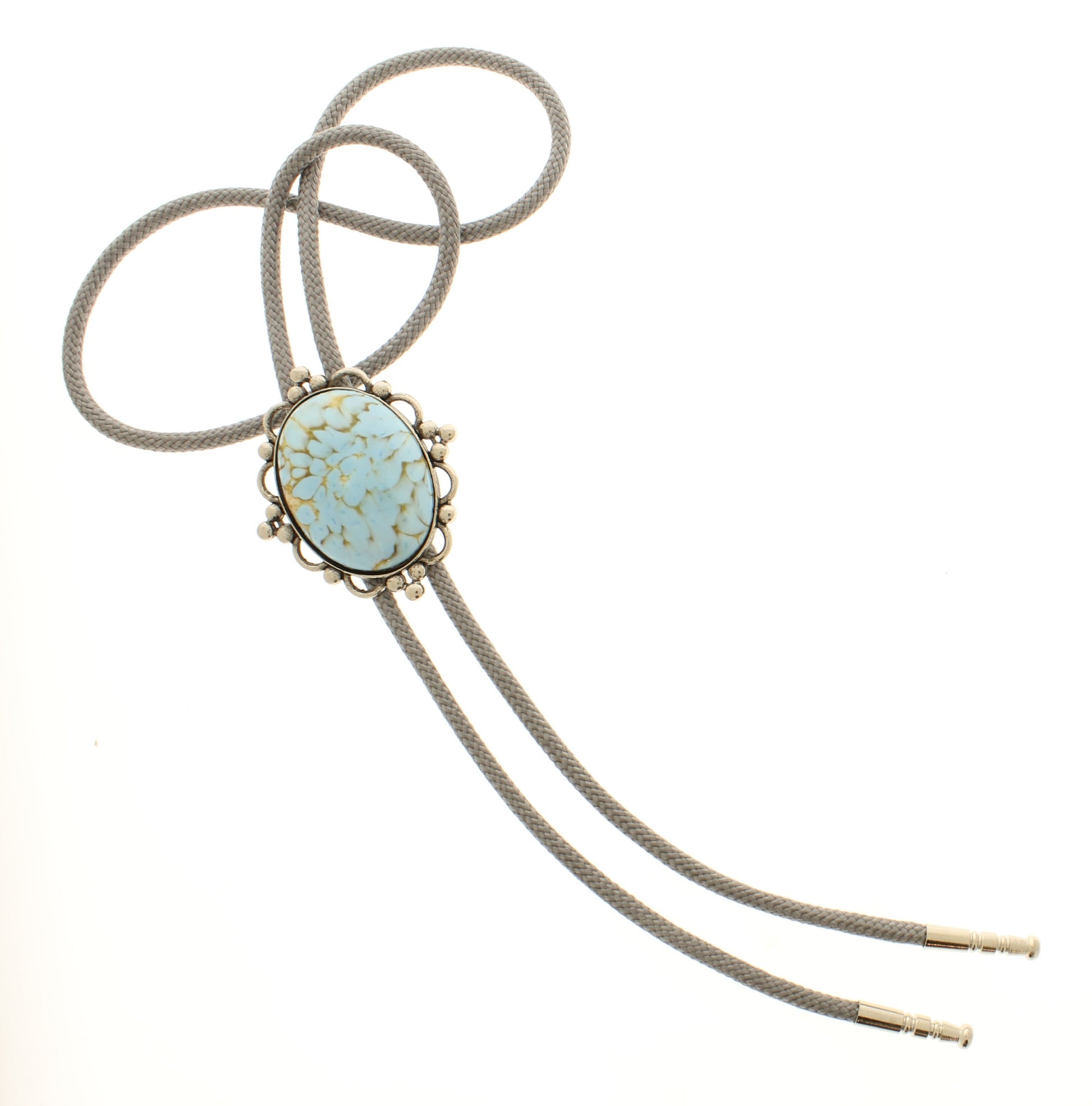 A quiet statement in silver and sky. The centerpiece—a large oval turquoise stone—rests in a cradle of silver-toned metal, framed by delicate beading like a whisper of desert wind. The gray woven cord adds a soft contrast, grounding the piece in subtle elegance. Each metal tip gleams with understated polish, completing a bolo tie that speaks in calm tones of heritage, craftsmanship, and the open plains.