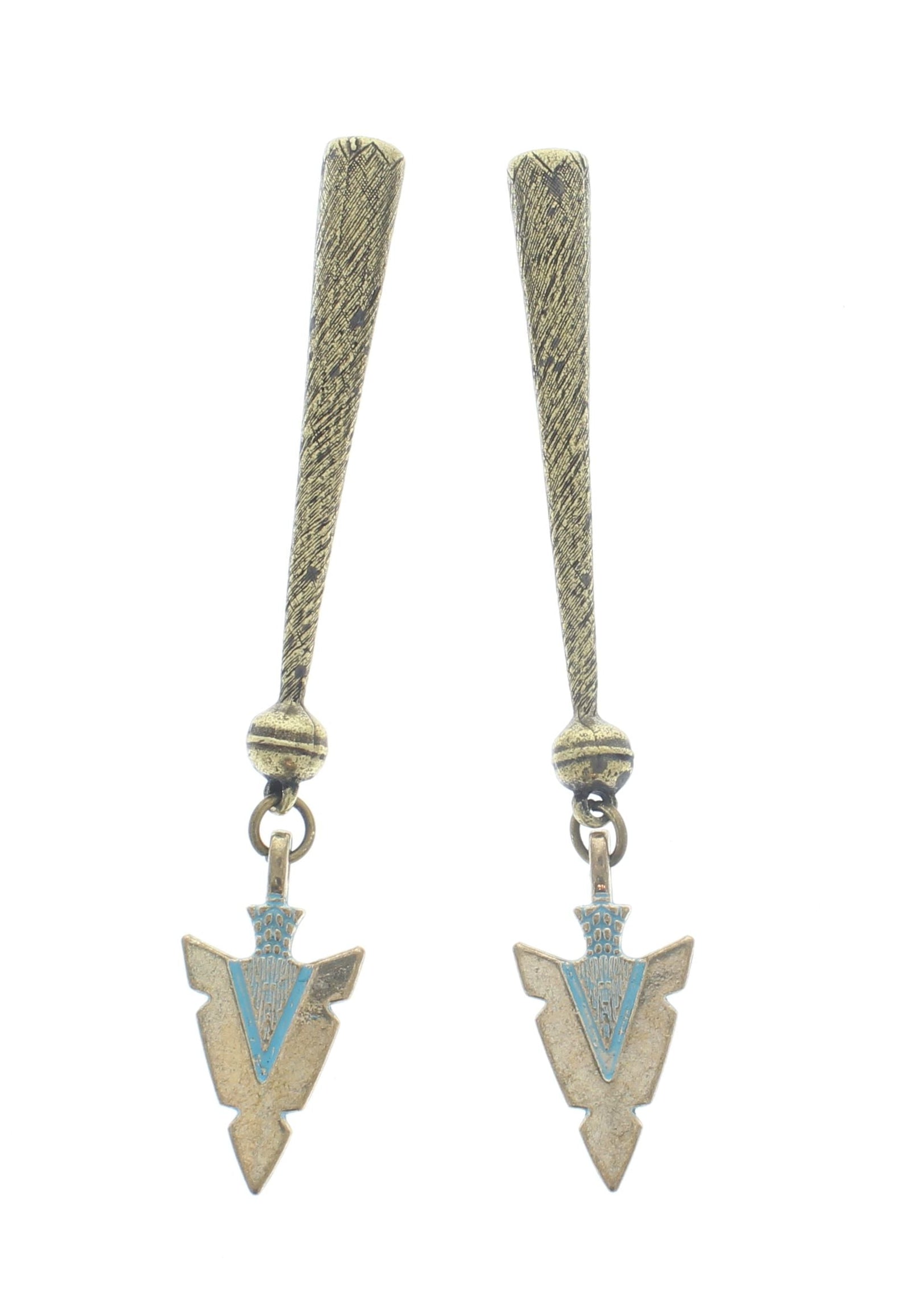 These handcrafted bolo tips feature elongated, textured metallic rods ending in bold gold arrowhead charms. With their geometric lines and frontier spirit, they evoke the grit of desert trails and the precision of a well-aimed path. Made in the USA, these tips are perfect for Western wear that speaks of direction, strength, and a touch of golden edge.