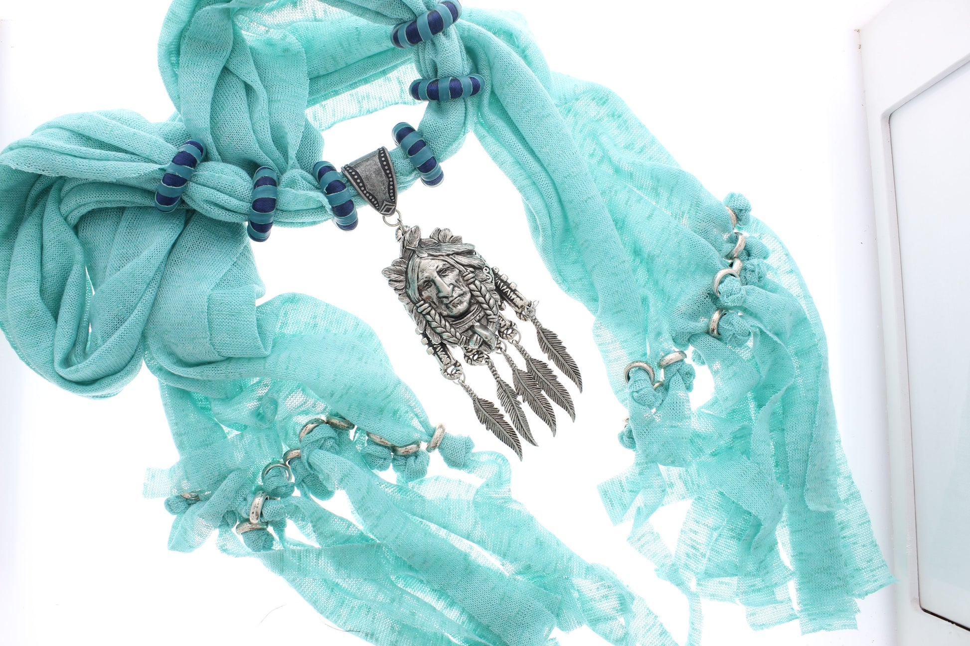 Elevate your style with this one-of-a-kind, hand-pieced scarf measuring 60" in length. Crafted from soft, textured turquoise fabric, it features rich embellishments including deep blue and purple beads, silver-toned rings, and a striking central pendant. The pendant showcases a detailed face with an ornate headdress and feather-like accents, adding a bold, artistic flair. Finished with metallic charms along the fringes, this scarf blends bohemian elegance with tribal-inspired design—perfect for statement wear, gifting, or adding a touch of soul to any outfit.