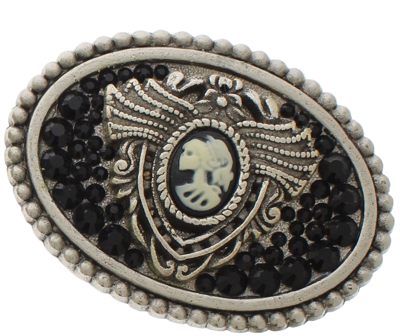 This elegant oval belt buckle features a vintage-inspired cameo centerpiece framed in detailed silver filigree. Surrounding the cameo are clusters of faceted black stones that add depth and sophistication. The ornate metalwork and antique finish give it a classic Victorian or gothic aesthetic, making it a striking accessory for both casual and formal wear.