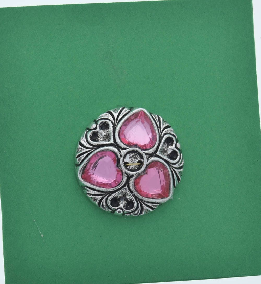 HHH Jewelry Supply Store Vintage Button, 2 hole, antique silver plated with pink crystal stones, made in Germany, pack of 4