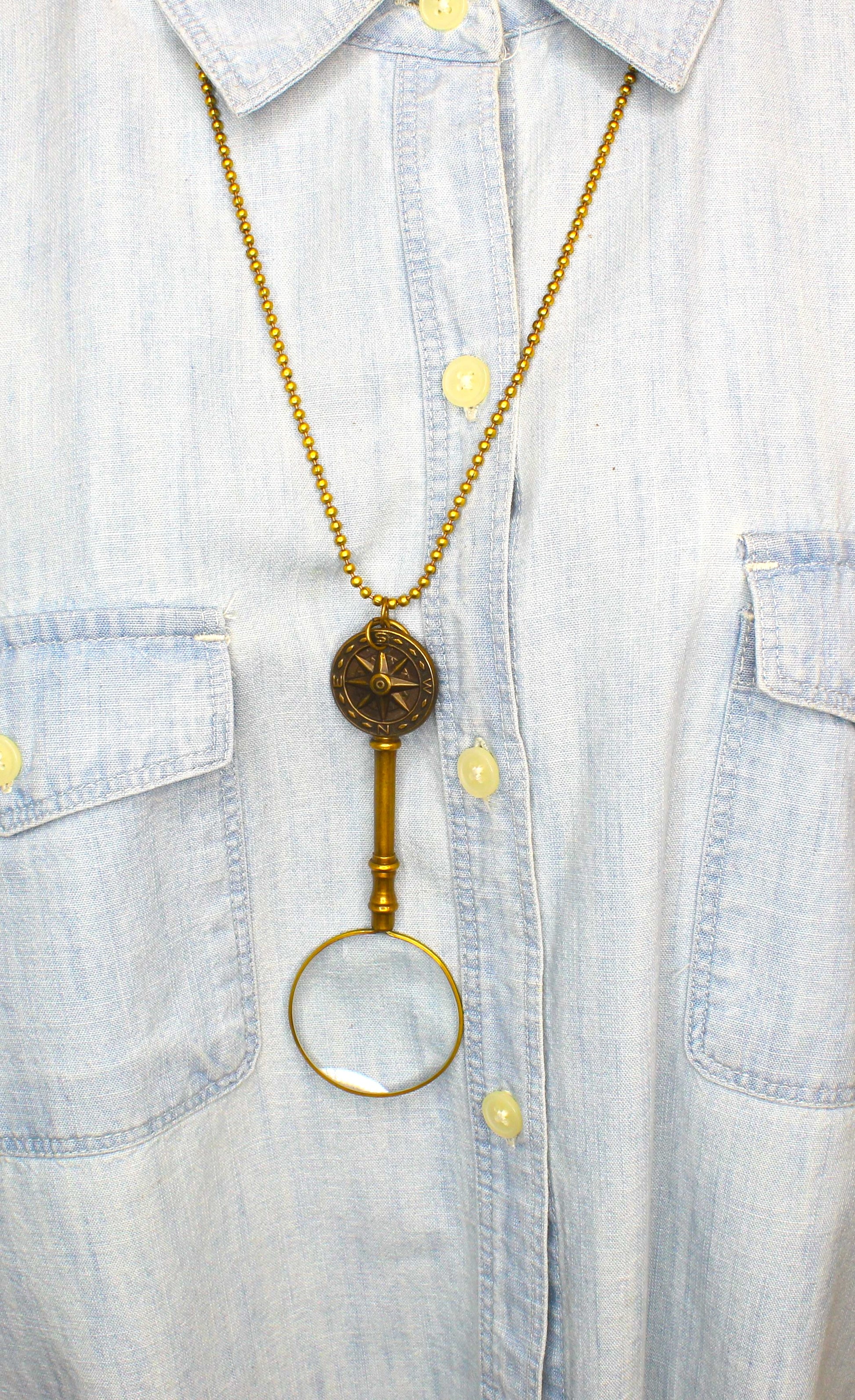 This whimsical magnifier necklace features a vintage-style brass handle paired with a classic compass charm, suspended on a delicate beaded chain. A charming fusion of curiosity and direction, it's perfect for adventurers, readers, or seekers of hidden details. Functional, stylish, and full of character.